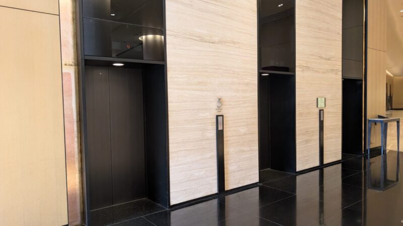 ベージュトーンの石材とブラックのエレベータードアのコントラストが美しく、