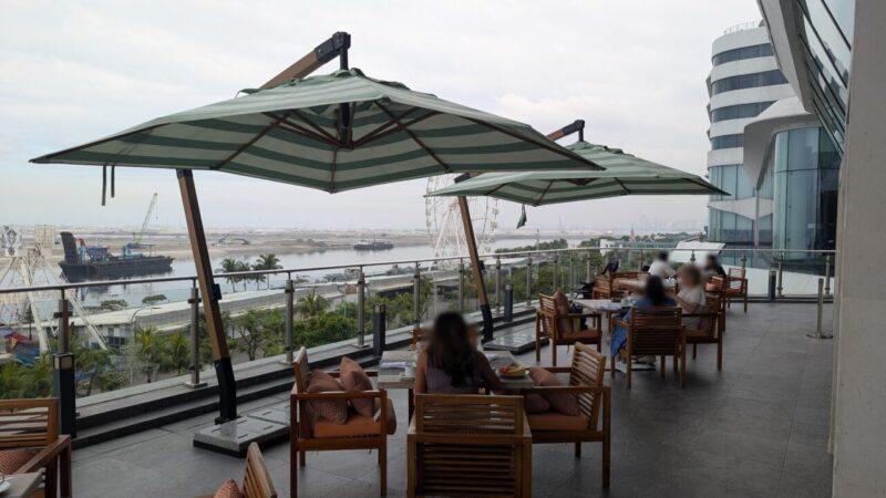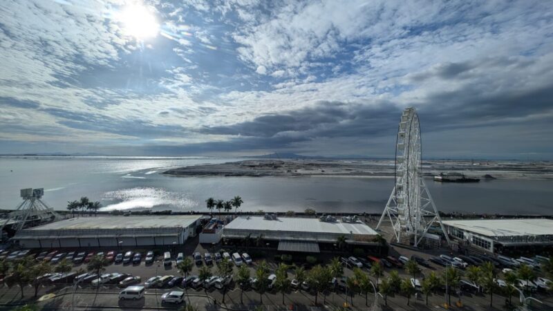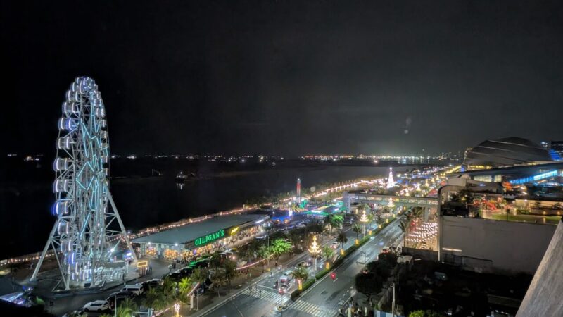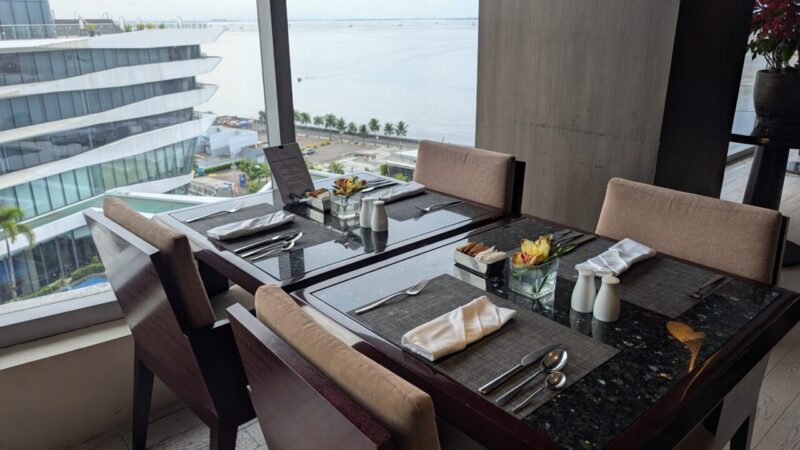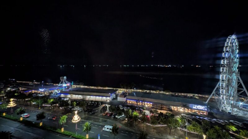 大きなガラスウォール越しに広がるのはマニラ湾方面の景色と観覧車。