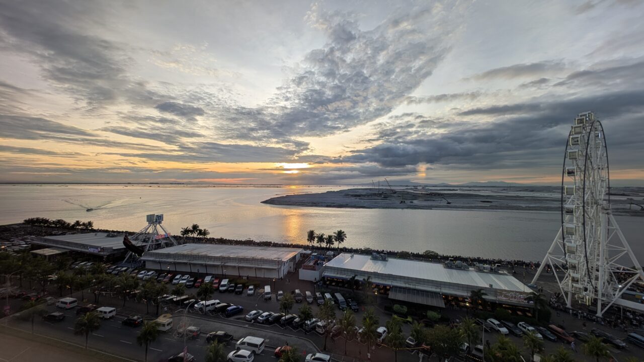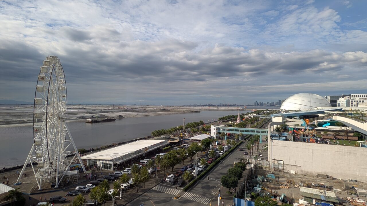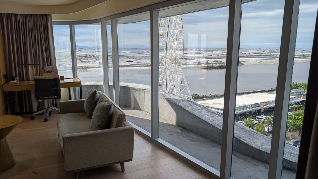 大きなガラスウォール越しに広がるのはマニラ湾方面の景色と観覧車。