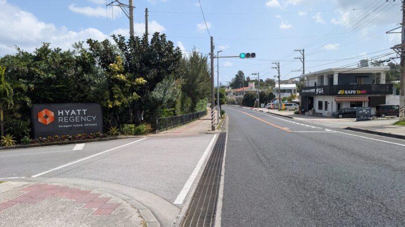 恩納村に入り、海沿いの国道58号線を北上していくと、道路脇に「HYATT REGENCY」の銘板が見えてきます。この看板が目に入ると「あぁ、帰ってきたなぁ」と実感します。このホテルは小さな島全体がリゾートになっていて、橋を渡ってホテルへ。何度か来ていますが、ここに差し掛かると、整いモードへ自然と気持ちが切り替わる感じがあります。