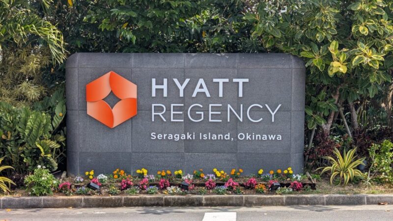 銘板は「HYATT REGENCY Seragaki Island, Okinawa」と書かれたシンプルなサイン。石の質感とブランドカラーのオレンジが印象的で、意外と存在感があります。