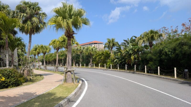 橋を渡りきると、ホテル本館に到着。正面には赤瓦の屋根とヤシの木が並び、沖縄らしいリゾートホテルの雰囲気が広がります。建物自体は7階とそこまで高層ではありませんが、前の広場や車寄せにゆとりがあるので、実際に見るとかなりスケール感があります。