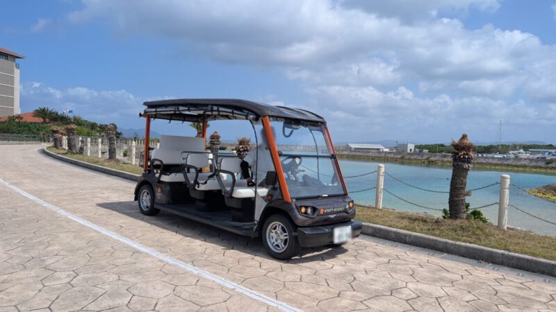 橋の上では、ホテルのカートとすれ違うこともあります。瀬良垣アイランド沖縄は、本館とビーチハウスの間の移動などで、このカートが活躍しています。