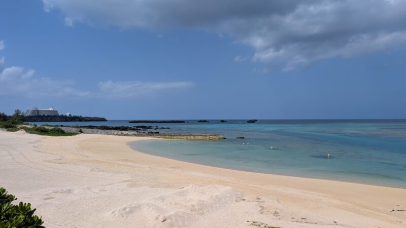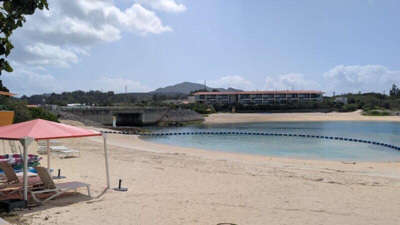 そして少し進むと、ホテル本館の前にあるビーチも見えます。ホテル棟のすぐ目の前、白い砂浜と透明度の高い海が広がっています。