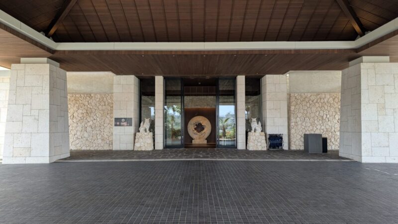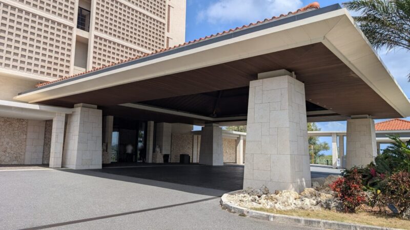 本館の車寄せに到着。屋根が大きく張り出したつくりになっていて、リゾートホテルらしいゆったりしたエントランスです。柱には石材が使われていて、全体的に落ち着いた沖縄リゾートのデザイン。派手さはないですが、しっかり高級感があります。