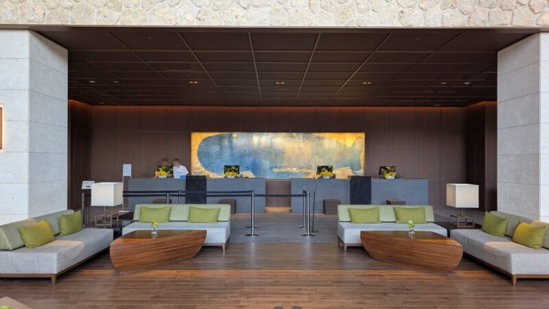 ロビーのフロントデスク。奥の大きなクジラ?のアートが印象的。カウンターも横に長く取られていて、リゾートホテルらしく余裕のあるつくり。