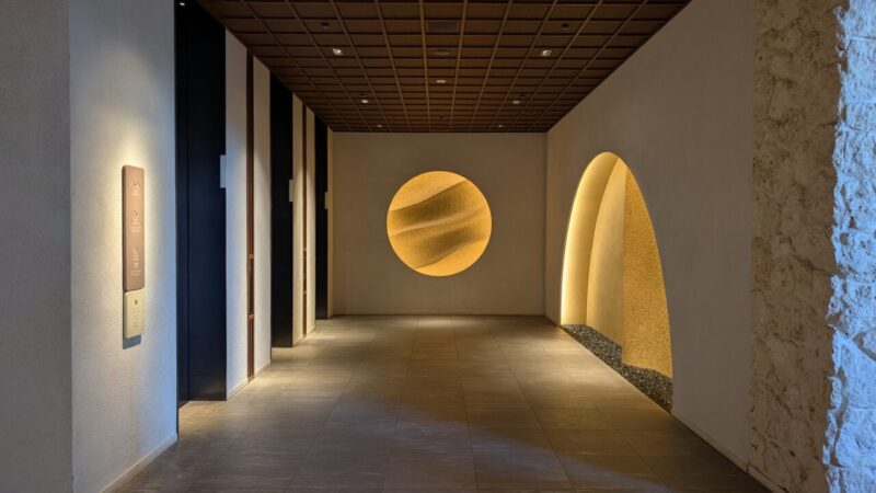 ロビーの奥にあるエレベーターホールも、瀬良垣らしい印象的なデザイン。正面には丸い壁面のオブジェがあり、柔らかい照明でライトアップされた空間。アートのような雰囲気。ホテルのエレベーターホールは機能的な空間になりがちですが、ここはちょっとしたフォトスポットのような場所。