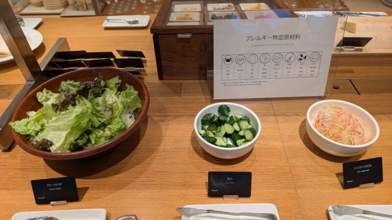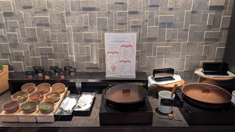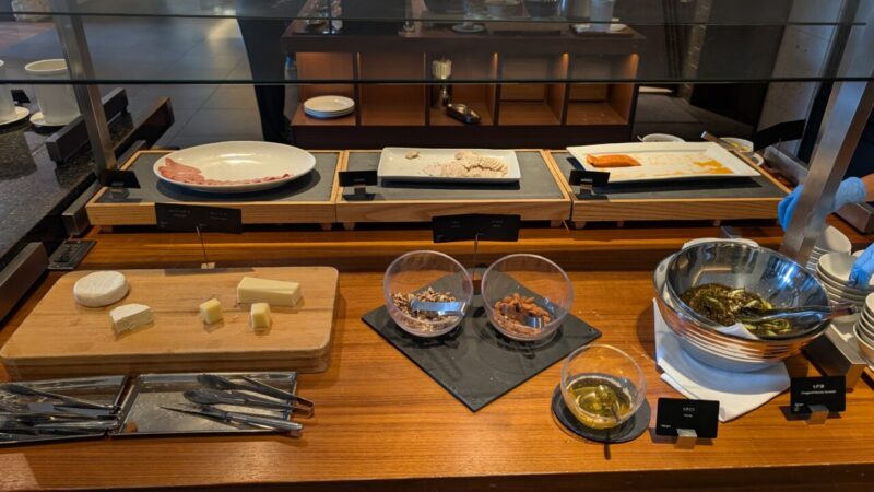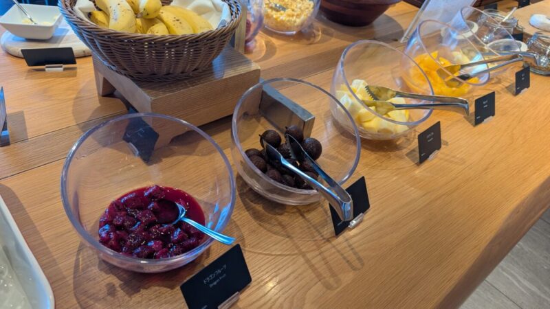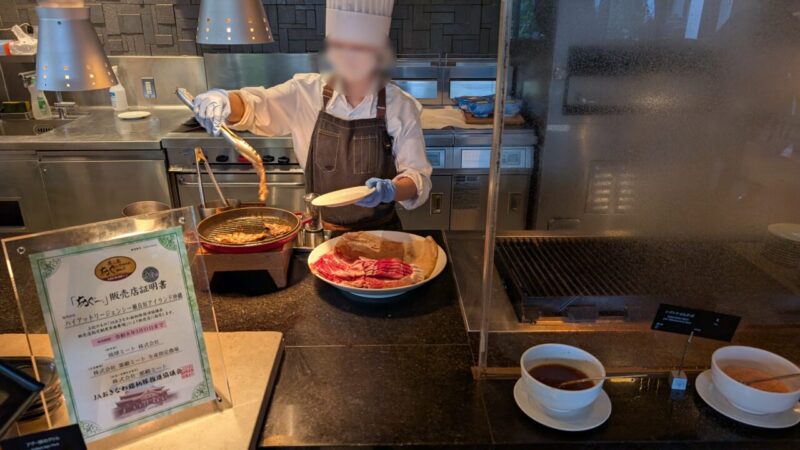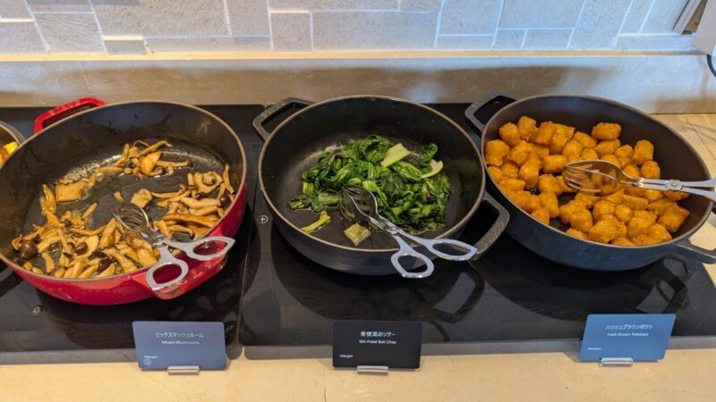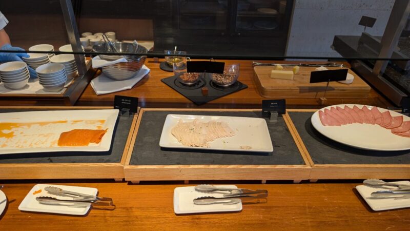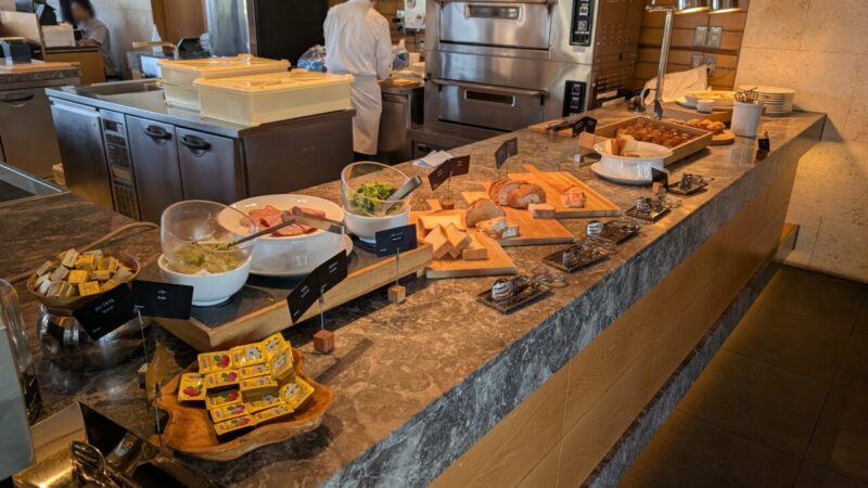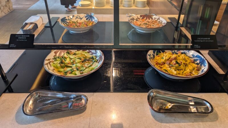 ライブキッチンではステーキ、オムレツなどを作ってもらえ、ビュッフェ台にはシャルキュトリー、サラダ、フルーツ、パンなどの洋食メニューが並びます。焼き魚やお粥などの和食も用意されているので、気分に合わせて選べるのも嬉しいポイント。フレンチトーストにソフトクリームをトッピングする“朝デザート”もおすすめ。