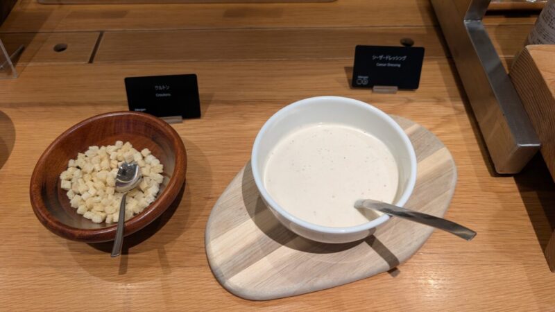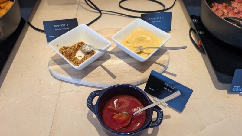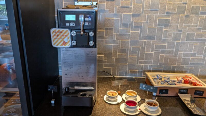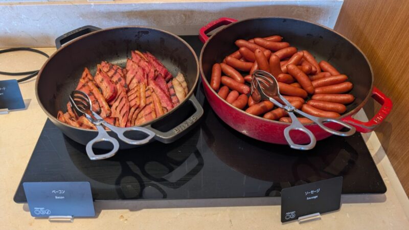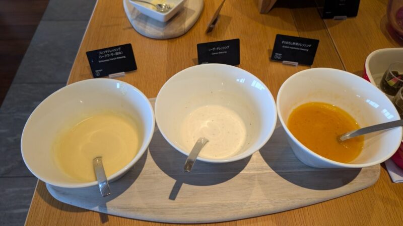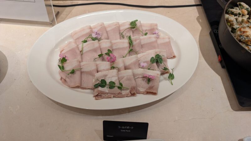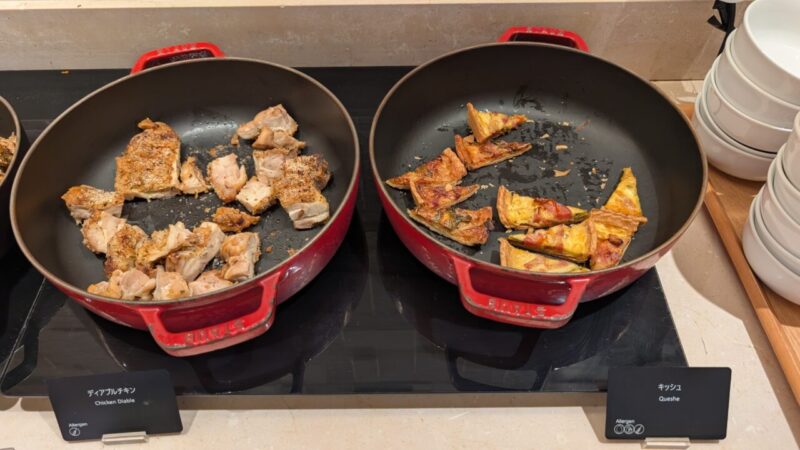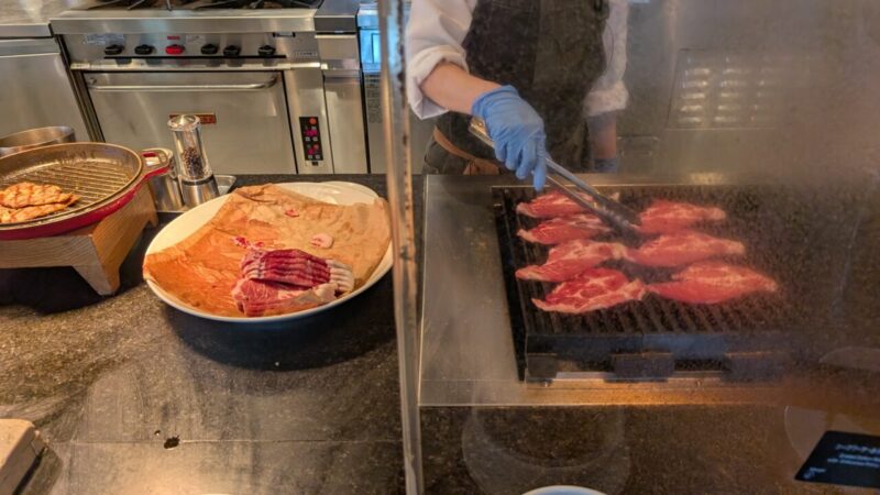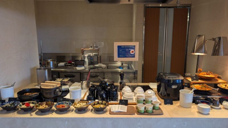 ライブキッチンではステーキ、オムレツなどを作ってもらえ、ビュッフェ台にはシャルキュトリー、サラダ、フルーツ、パンなどの洋食メニューが並びます。焼き魚やお粥などの和食も用意されているので、気分に合わせて選べるのも嬉しいポイント。フレンチトーストにソフトクリームをトッピングする“朝デザート”もおすすめ。