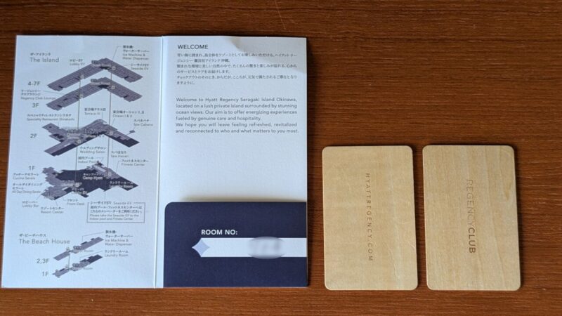 チェックイン手続きが終わると、ルームキーが渡されます。ルームキーは木製。触り心地がいい!さりげなく「REGENCY CLUB」の刻印が入っていて、ラウンジアクセス用のルームキーだとわかります。キーケースには館内案内図も。