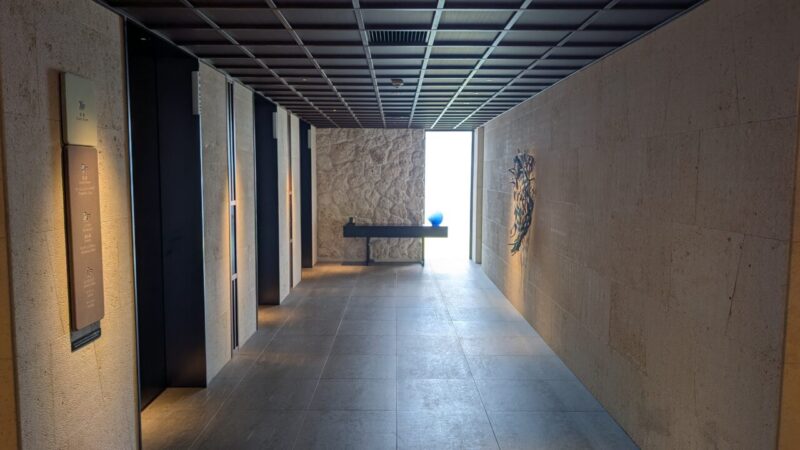エレベーターホールは石材と木を組み合わせた落ち着いたデザイン。奥には自然光が差し込む窓があり、リゾートホテルらしい明るさ。壁にはアートも飾られていて、目を楽しませてくれます。こうした細かい空間づくりも、このホテルの特徴です。