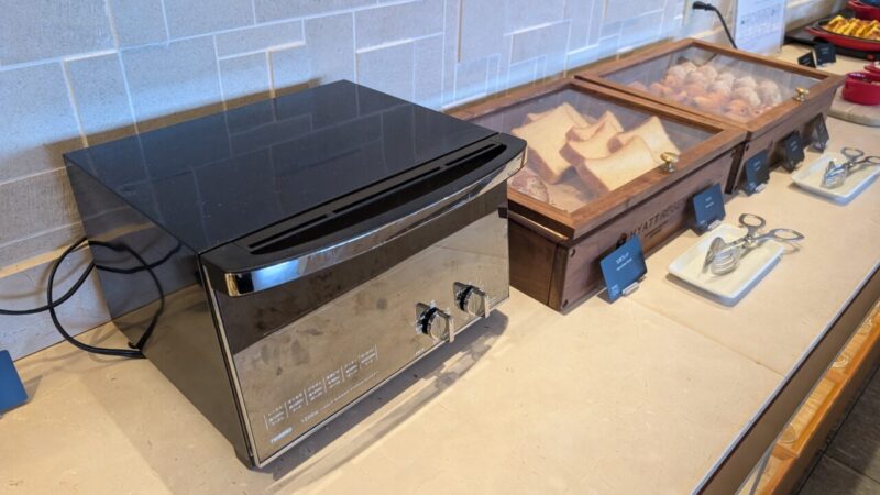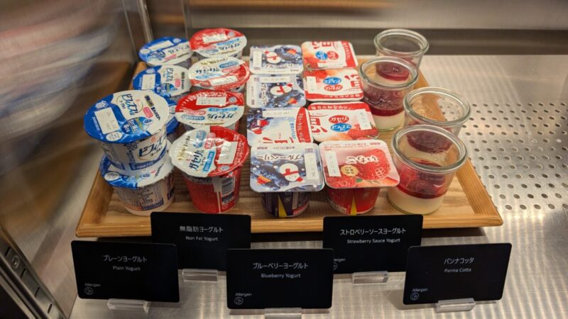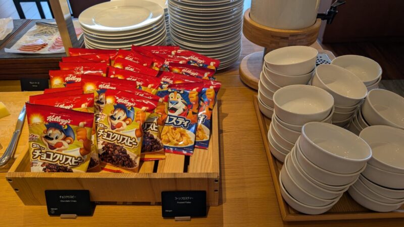 シリアルは、コーンフレークとチョコクリスピーの2種類、個包装タイプ。横には電子レンジも置かれているので、牛乳を温めてホットシリアルにすることもできます。