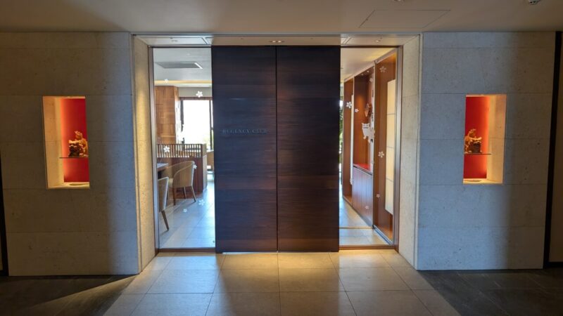 クラブラウンジ「リージェンシークラブ」の入口。落ち着いた木の扉に「REGENCY CLUB」の文字がさりげなく。両脇にはここにもシーサーが置かれていて、沖縄らしい演出。この先は上級会員向けの静かな空間という感じです。