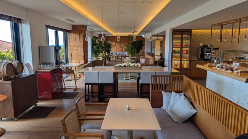 ハイアットリージェンシー瀬良垣ではグローバリストなどの上級会員は、このクラブラウンジでチェックインすることが多く、到着後はスタッフに案内されてそのままここへ。ロビーのフロントに並ぶ必要がないので、滞在のスタートとしてもかなりスムーズです。ここからラウンジに入り、チェックイン手続きを行います。