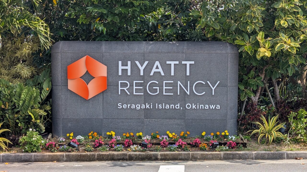 銘板は「HYATT REGENCY Seragaki Island, Okinawa」と書かれたシンプルなサイン。石の質感とブランドカラーのオレンジが印象的で、意外と存在感があります。