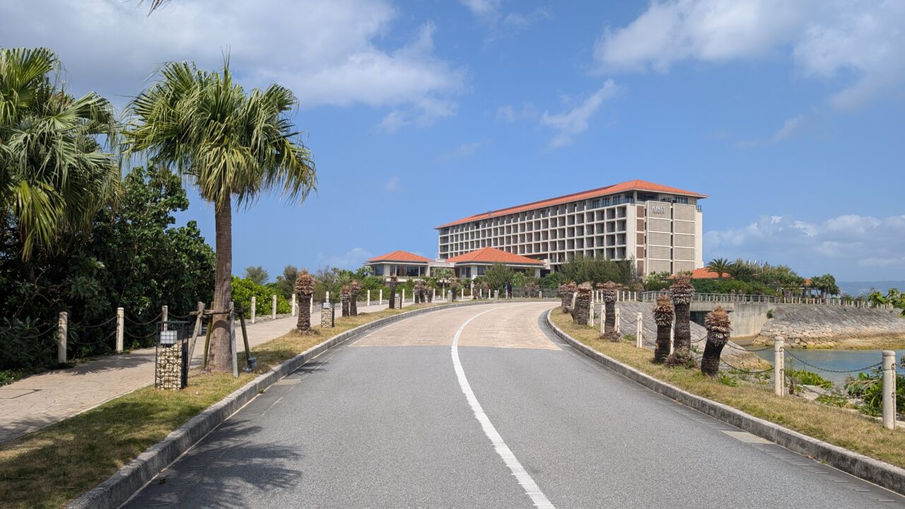 橋を渡りきると、ホテル本館に到着。正面には赤瓦の屋根とヤシの木が並び、沖縄らしいリゾートホテルの雰囲気が広がります。建物自体は7階とそこまで高層ではありませんが、前の広場や車寄せにゆとりがあるので、実際に見るとかなりスケール感があります。