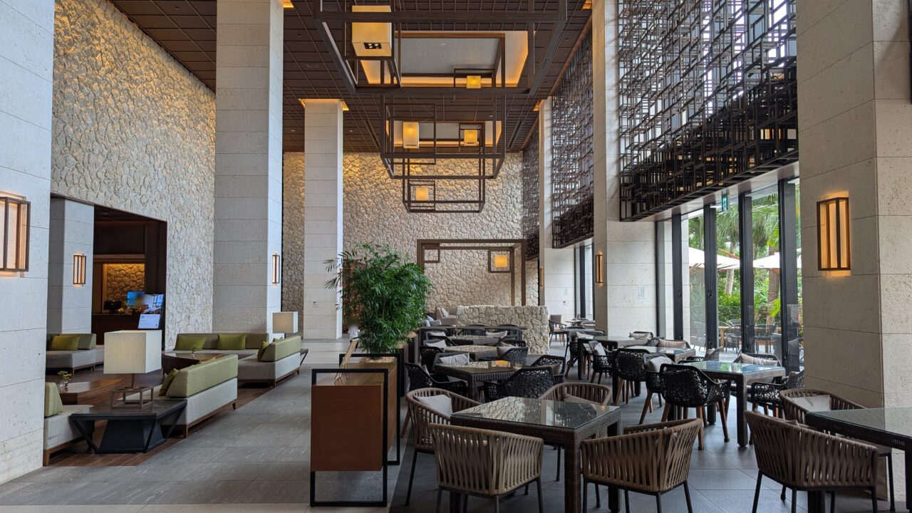 ロビーは天井が高くすごい開放感。石材の壁と木を組み合わせたデザインで、全体的に落ち着いた雰囲気。ゆったりしたソファ席やテーブル席が並び、ロビーラウンジのような使い方もできる空間になっています。天井から下がる四角い照明も、このロビーの特徴的なデザインのひとつ。ここで少しゆっくりする人の姿もよく見かけます。