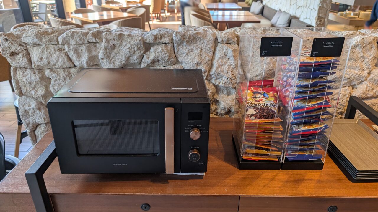 シリアルは、コーンフレークとチョコクリスピーの2種類、個包装タイプ。横には電子レンジも置かれているので、牛乳を温めてホットシリアルにすることもできます。