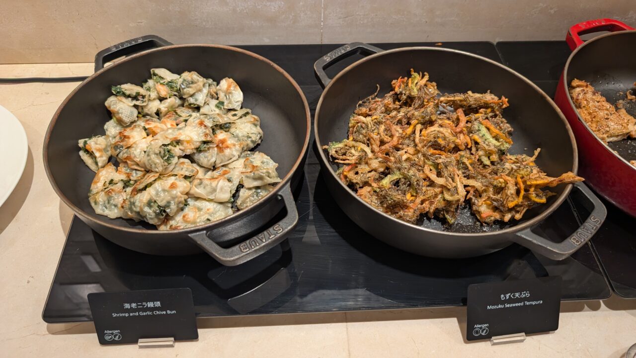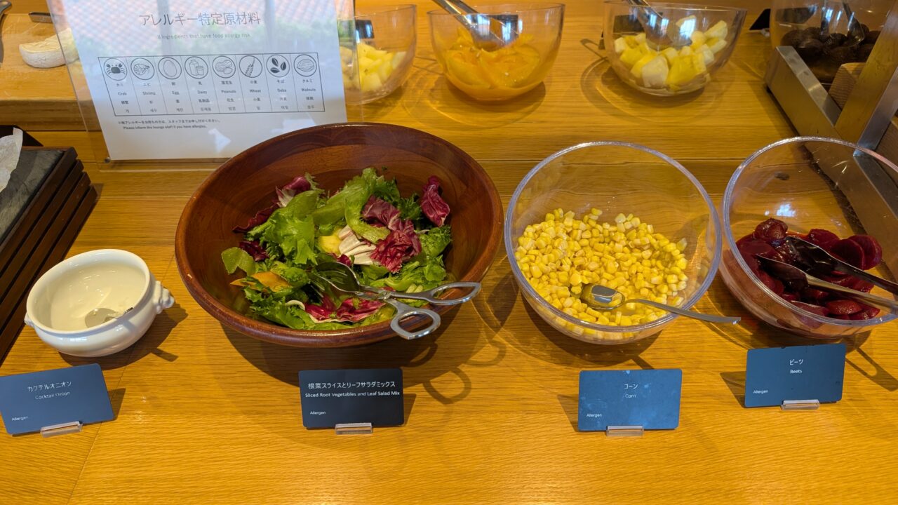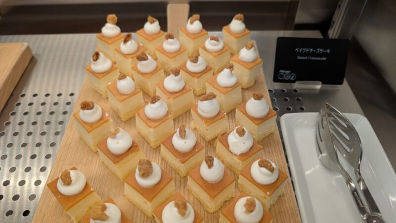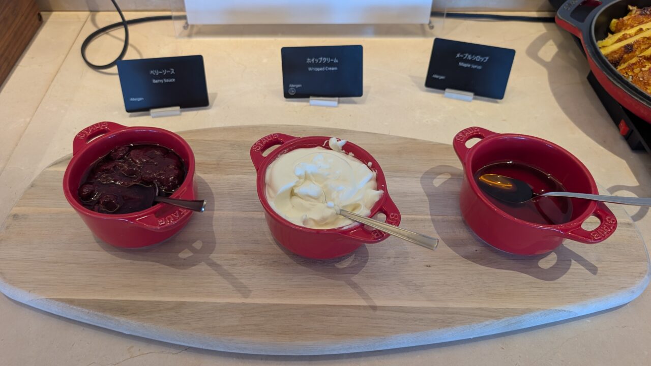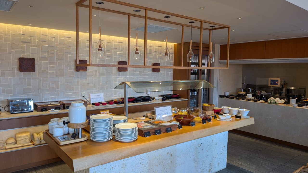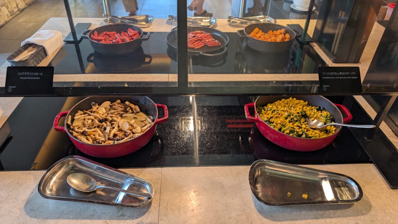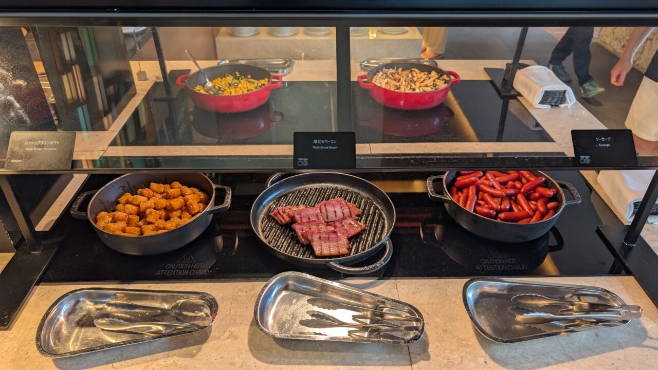 ライブキッチンではステーキ、オムレツなどを作ってもらえ、ビュッフェ台にはシャルキュトリー、サラダ、フルーツ、パンなどの洋食メニューが並びます。焼き魚やお粥などの和食も用意されているので、気分に合わせて選べるのも嬉しいポイント。フレンチトーストにソフトクリームをトッピングする“朝デザート”もおすすめ。