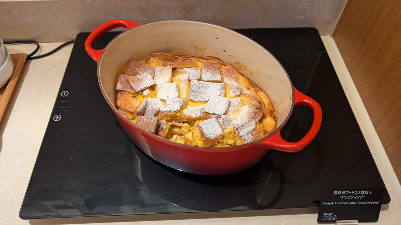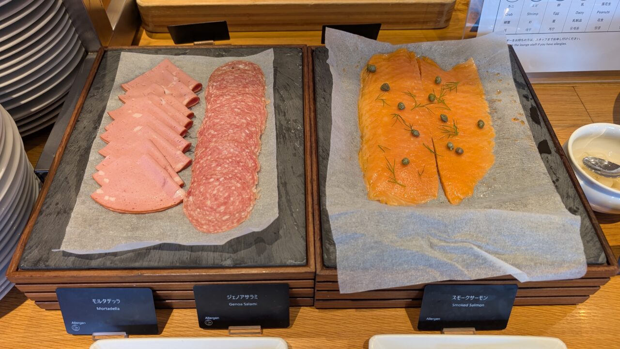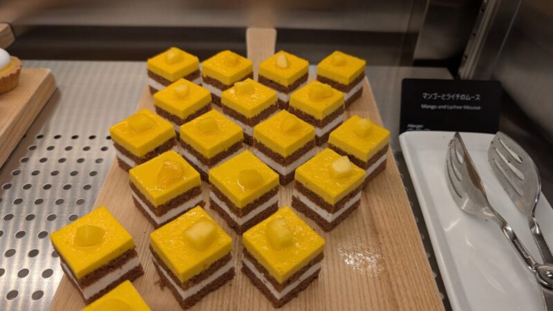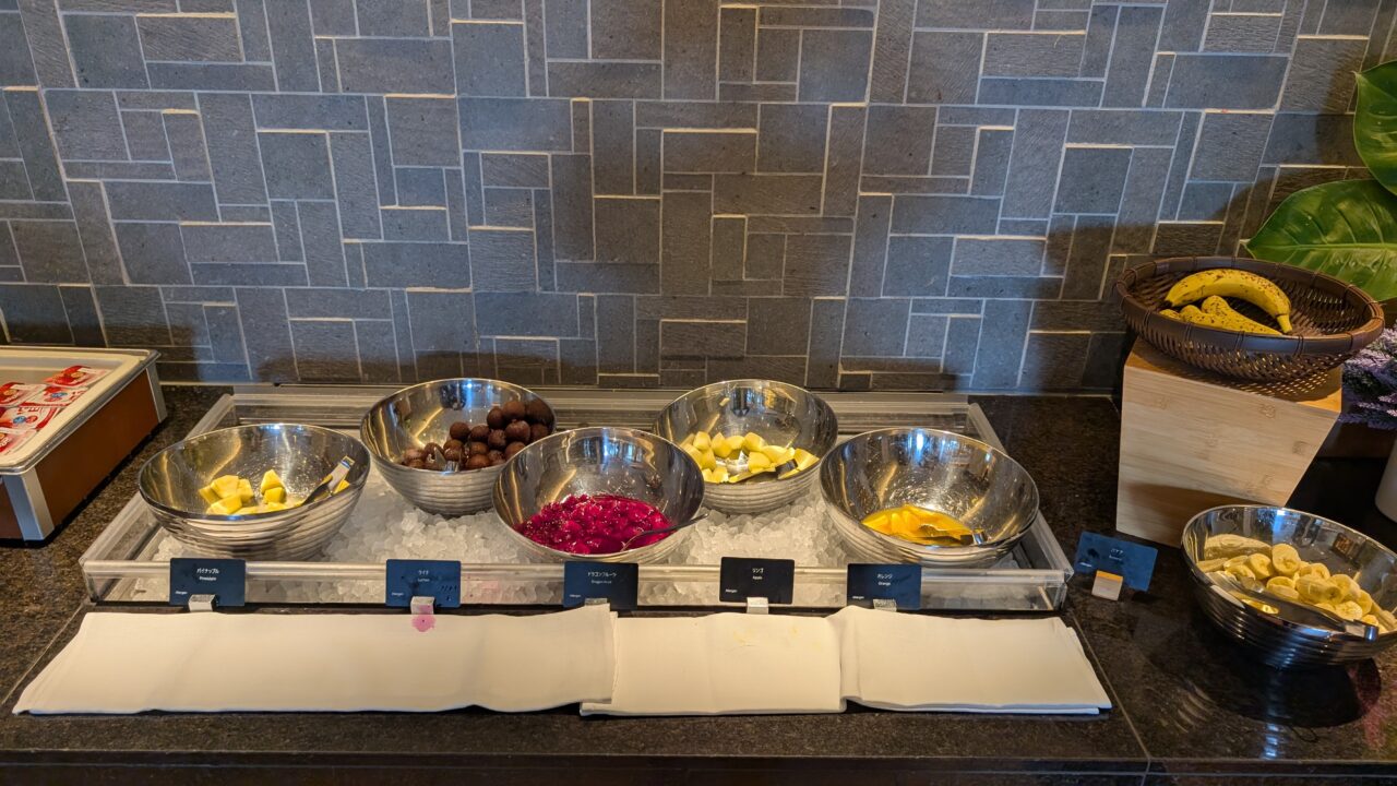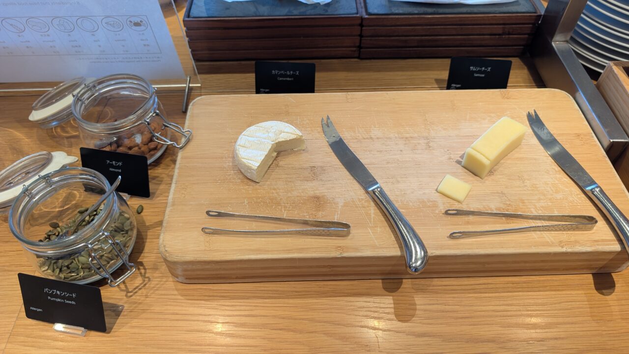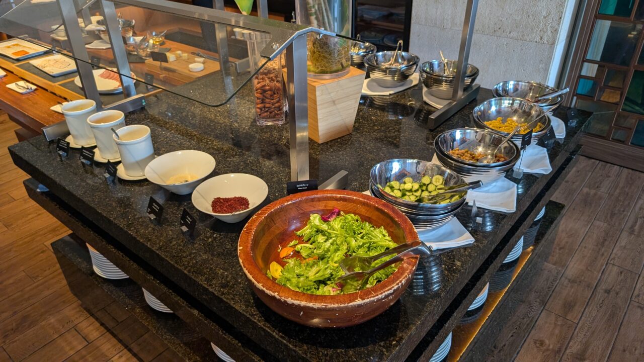 ライブキッチンではステーキ、オムレツなどを作ってもらえ、ビュッフェ台にはシャルキュトリー、サラダ、フルーツ、パンなどの洋食メニューが並びます。焼き魚やお粥などの和食も用意されているので、気分に合わせて選べるのも嬉しいポイント。フレンチトーストにソフトクリームをトッピングする“朝デザート”もおすすめ。