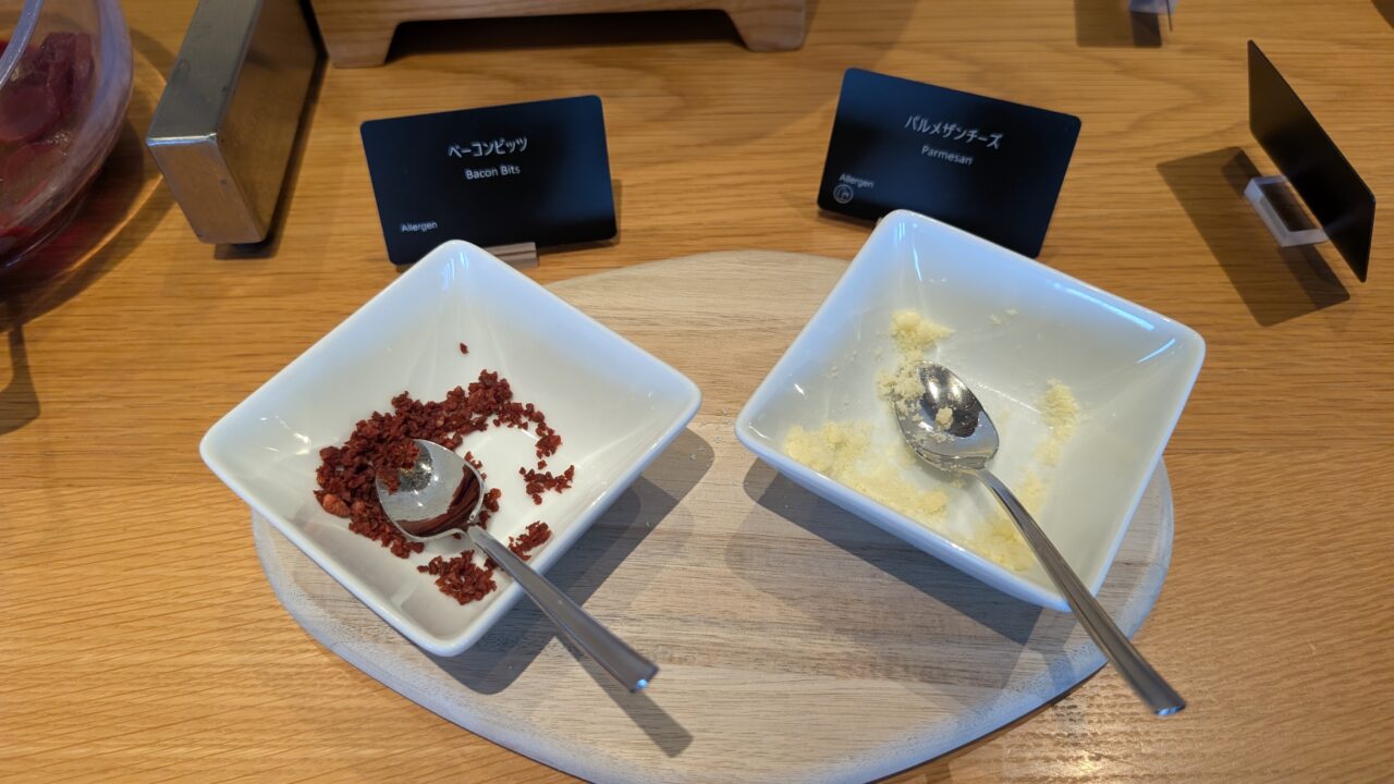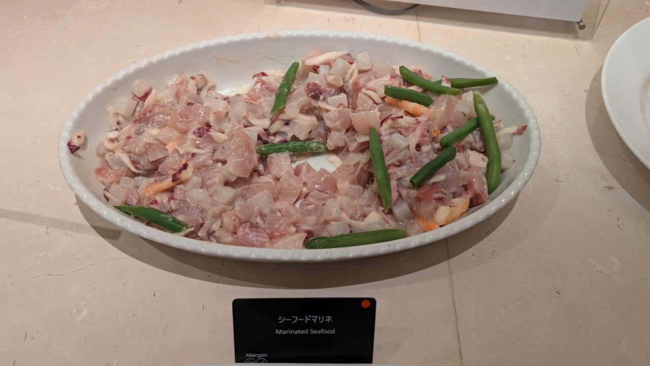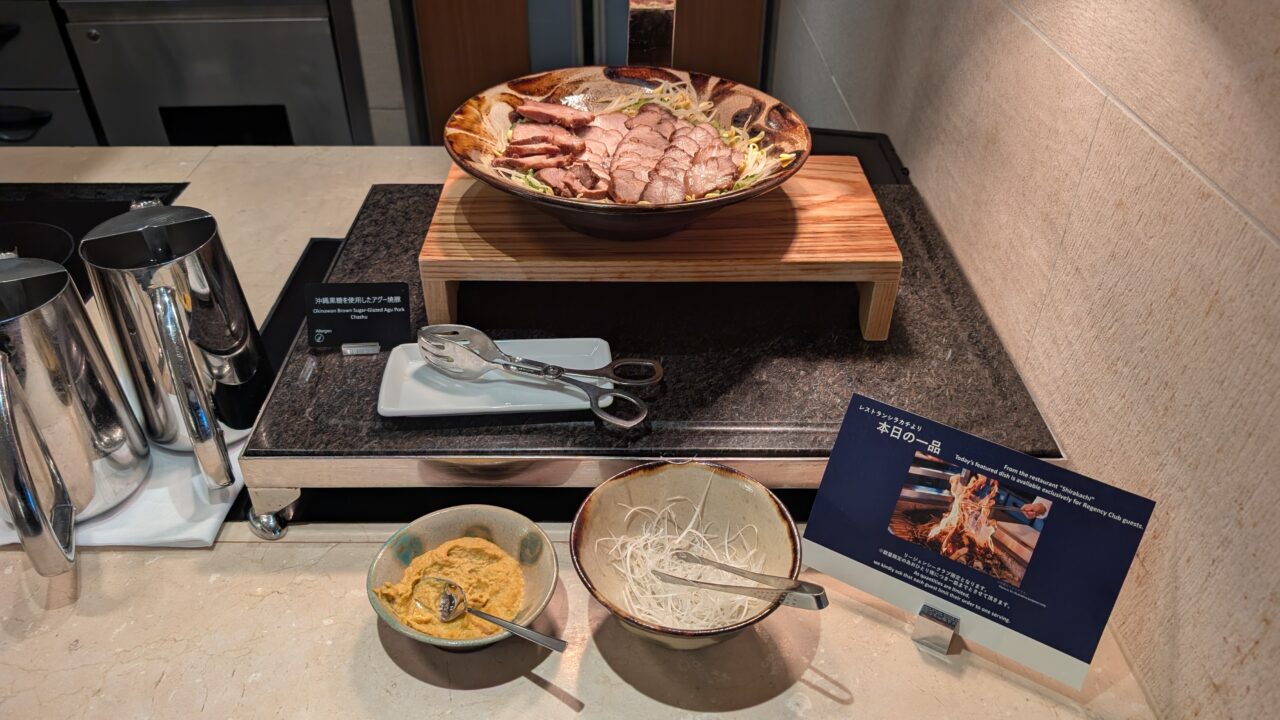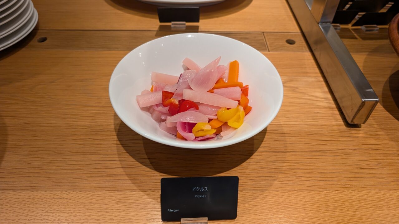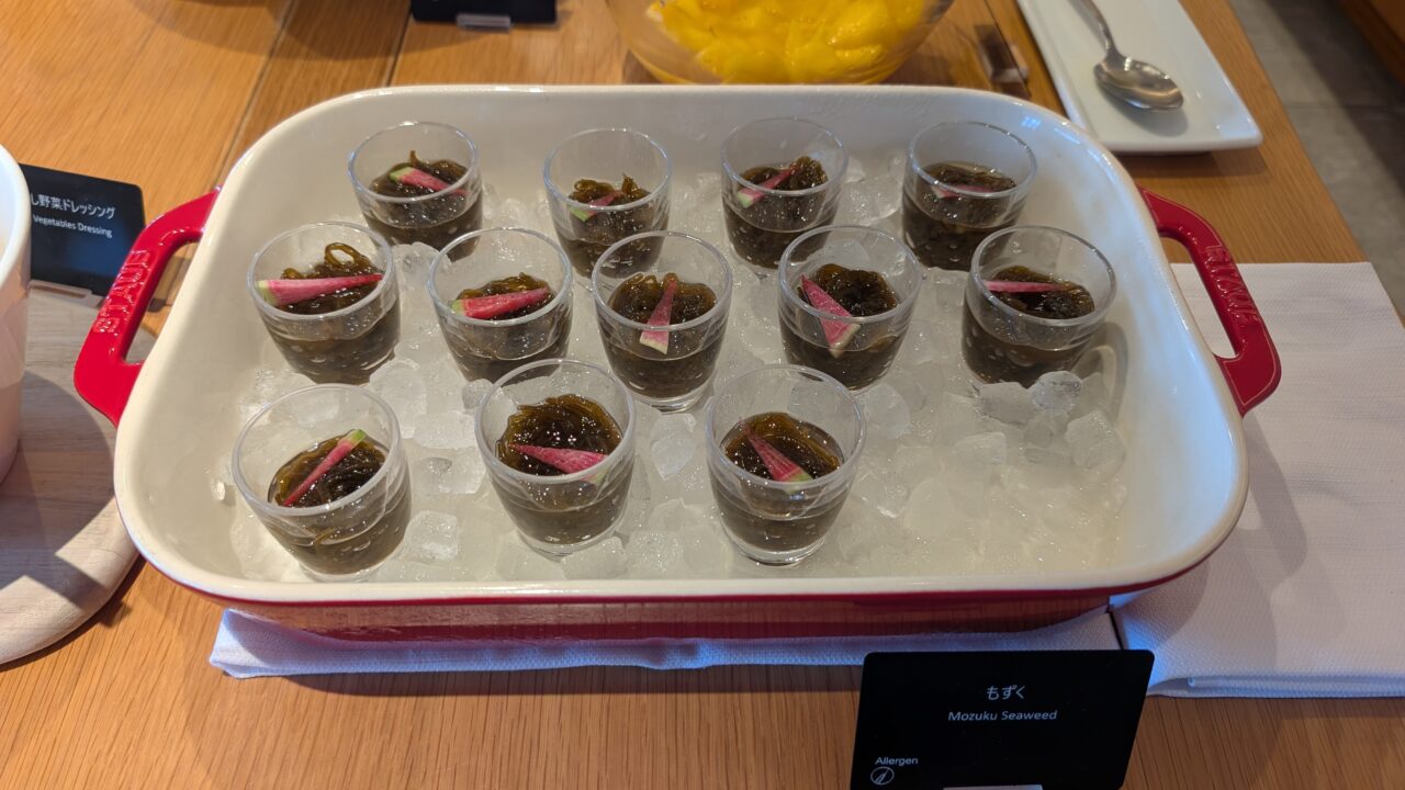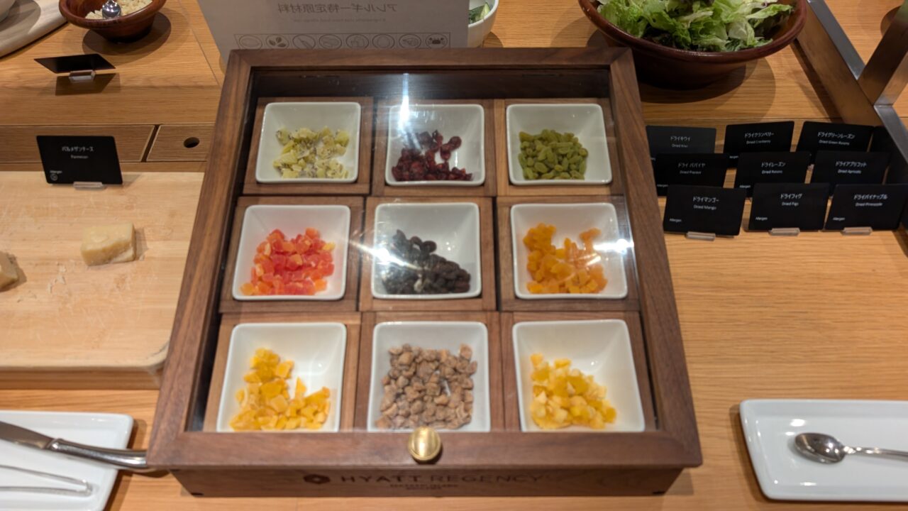 ライブキッチンではステーキ、オムレツなどを作ってもらえ、ビュッフェ台にはシャルキュトリー、サラダ、フルーツ、パンなどの洋食メニューが並びます。焼き魚やお粥などの和食も用意されているので、気分に合わせて選べるのも嬉しいポイント。フレンチトーストにソフトクリームをトッピングする“朝デザート”もおすすめ。