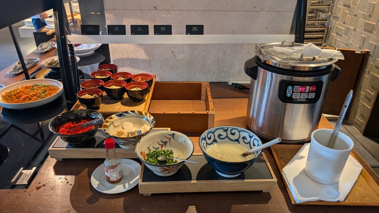 お粥コーナー。シンプルなお粥に、自分でトッピングを加えて仕上げるスタイル。ネギやザーサイ、薬味などがあり、好みに合わせてアレンジできます。