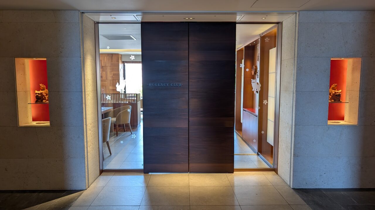 クラブラウンジ「リージェンシークラブ」の入口。落ち着いた木の扉に「REGENCY CLUB」の文字がさりげなく。両脇にはここにもシーサーが置かれていて、沖縄らしい演出。この先は上級会員向けの静かな空間という感じです。