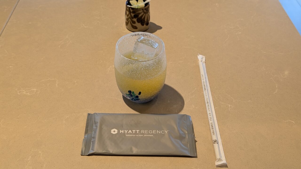 席に着くと、まずウェルカムドリンクが出てきます。オレンジ・ジャスミン・パッションフルーツをミックスしたドリンク。爽やかな柑橘の甘さにジャスミンの香りがほんのり加わっていて、到着後の一杯としてちょうどいい味です。グラスのデザインも沖縄らしい雰囲気で、見た目もきれい。