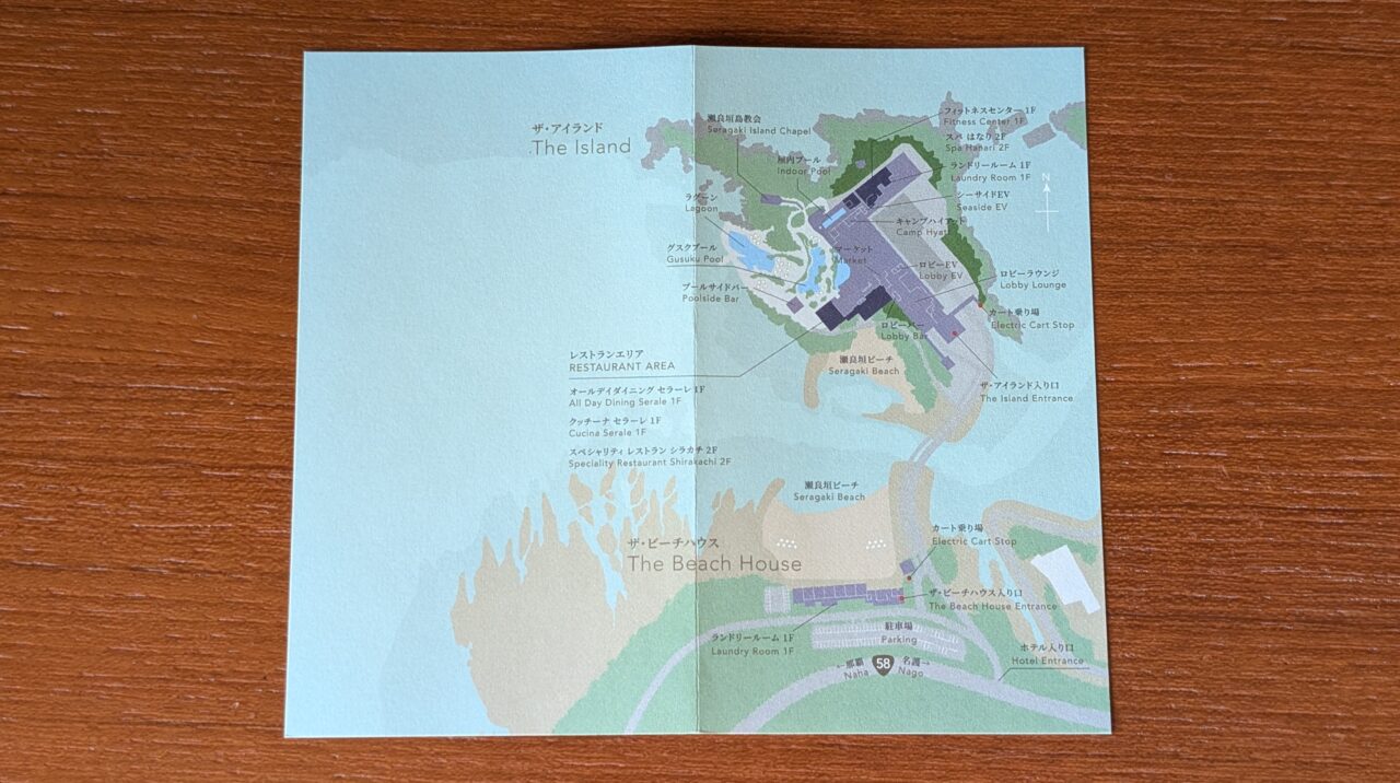 あと、敷地のマップも。小さな島全体がホテルになっているとわかります。アイランド側にホテル本館、本島側にビーチハウス。プールやレストラン、スパ、フィットネスなどの施設もあり。敷地自体はそれほど大きくはないですが、「ホテルが島になっている」というレイアウトがちょっと面白いです。