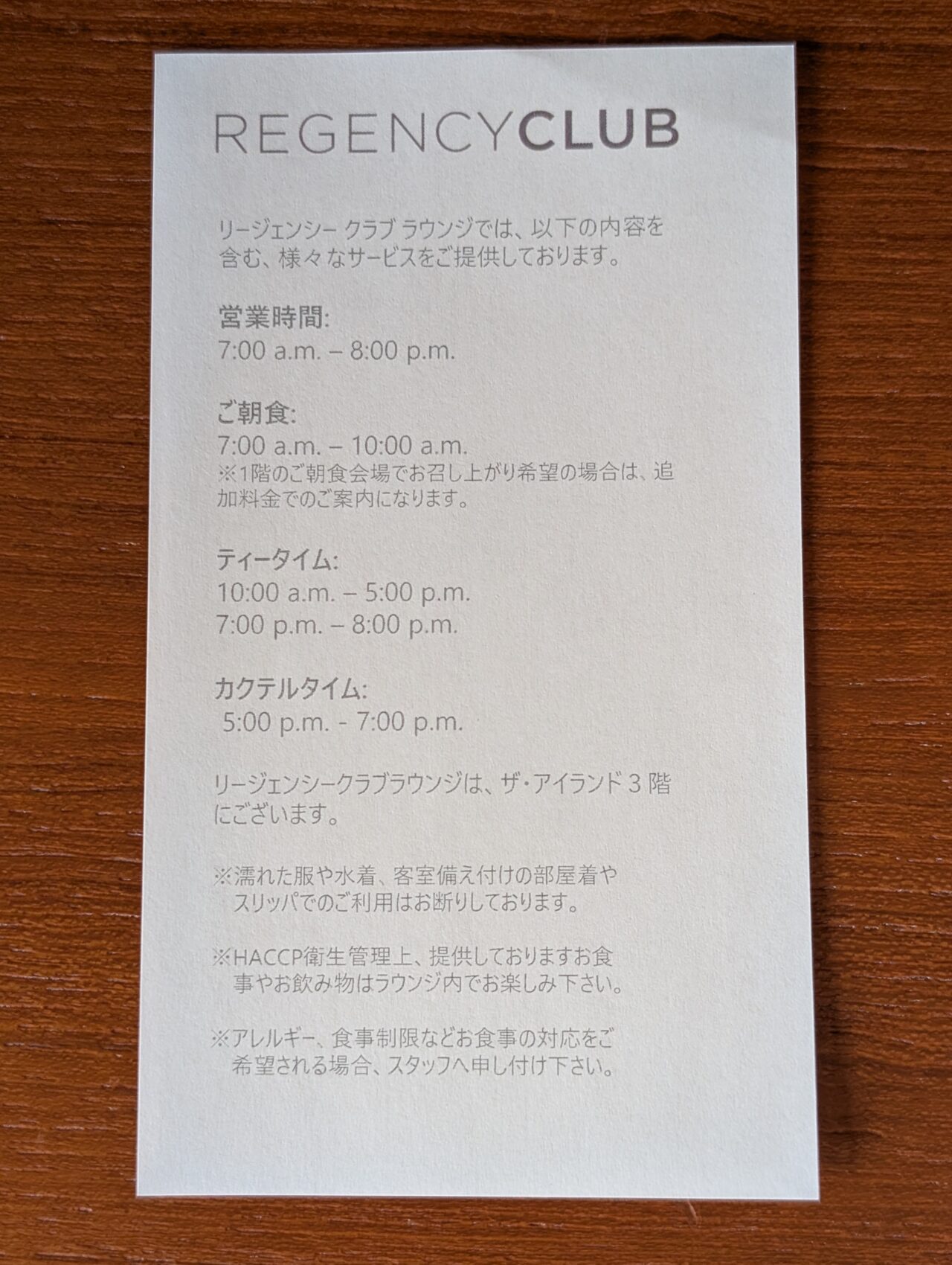 チェックイン手続きが終わると、ルームキーが渡されます。ルームキーは木製。触り心地がいい!さりげなく「REGENCY CLUB」の刻印が入っていて、ラウンジアクセス用のルームキーだとわかります。キーケースには館内案内図も。