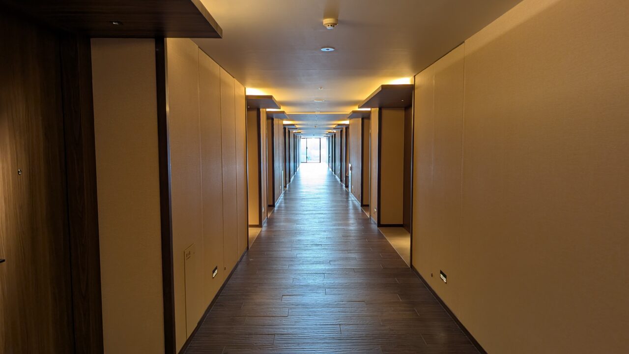 廊下は、木目を基調にした温かみのあるデザイン。照明は少し落ち着いたトーン。静かなリゾートの雰囲気が出ています。まっすぐ伸びる廊下は視線の抜けもよく、圧迫感がありません。