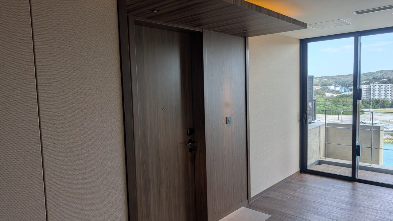 今回の部屋はコーナー。客室前は大きなスペース、窓もあり外の景色と自然光が入る設計です。いよいよ客室へ。