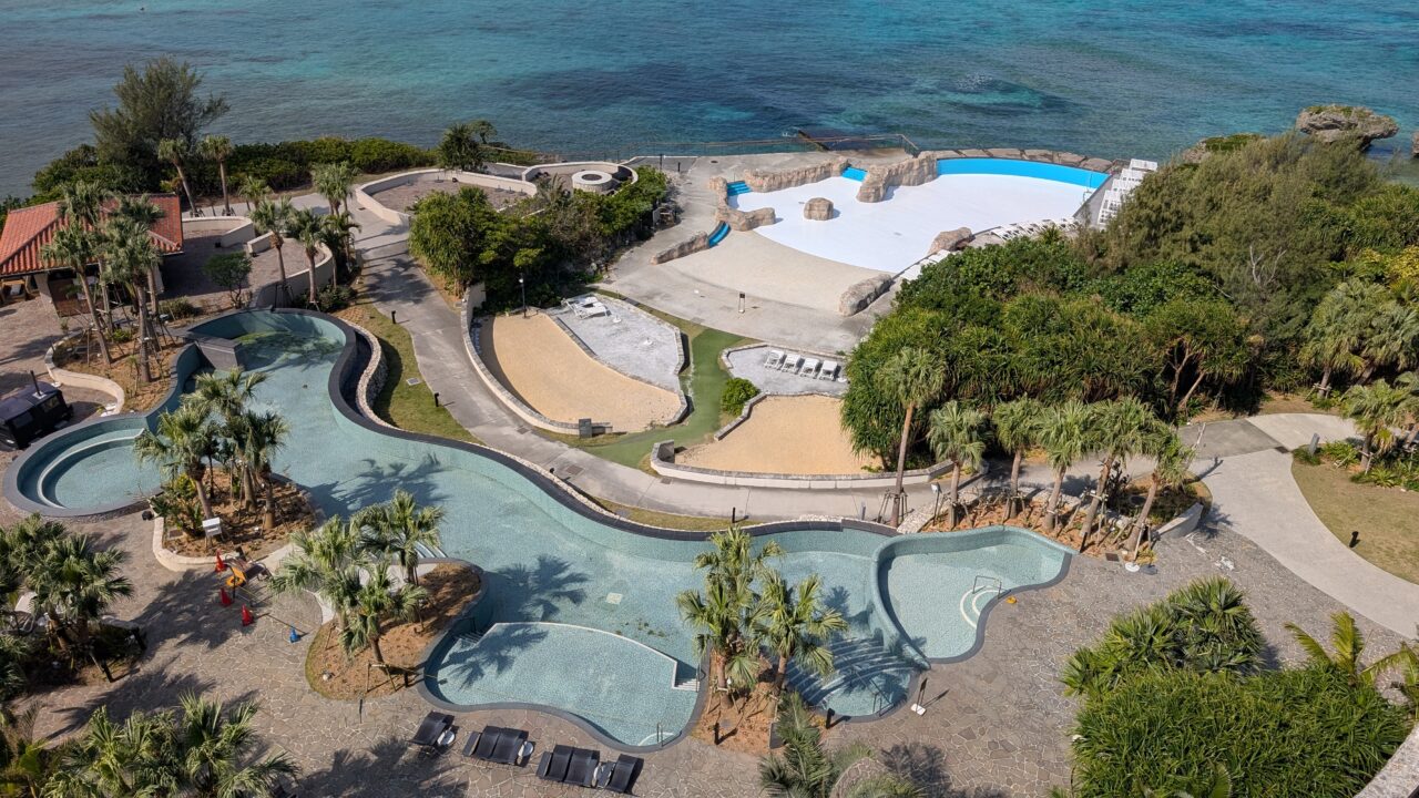 海に面して広がるのが、瀬良垣の屋外プールエリア。曲線を描くラグーン型のプールで、いかにもリゾートらしい雰囲気。