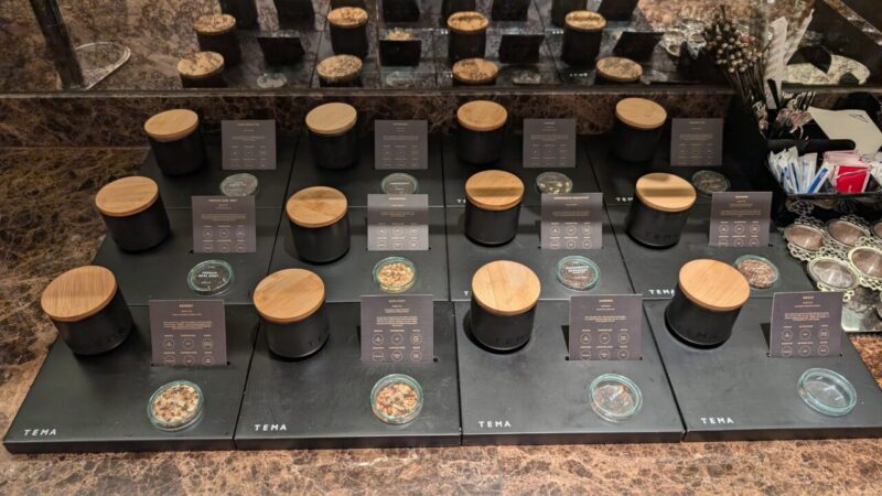 おしゃれなブラック&ウッドのティーボックスに、茶葉見本が並びます。