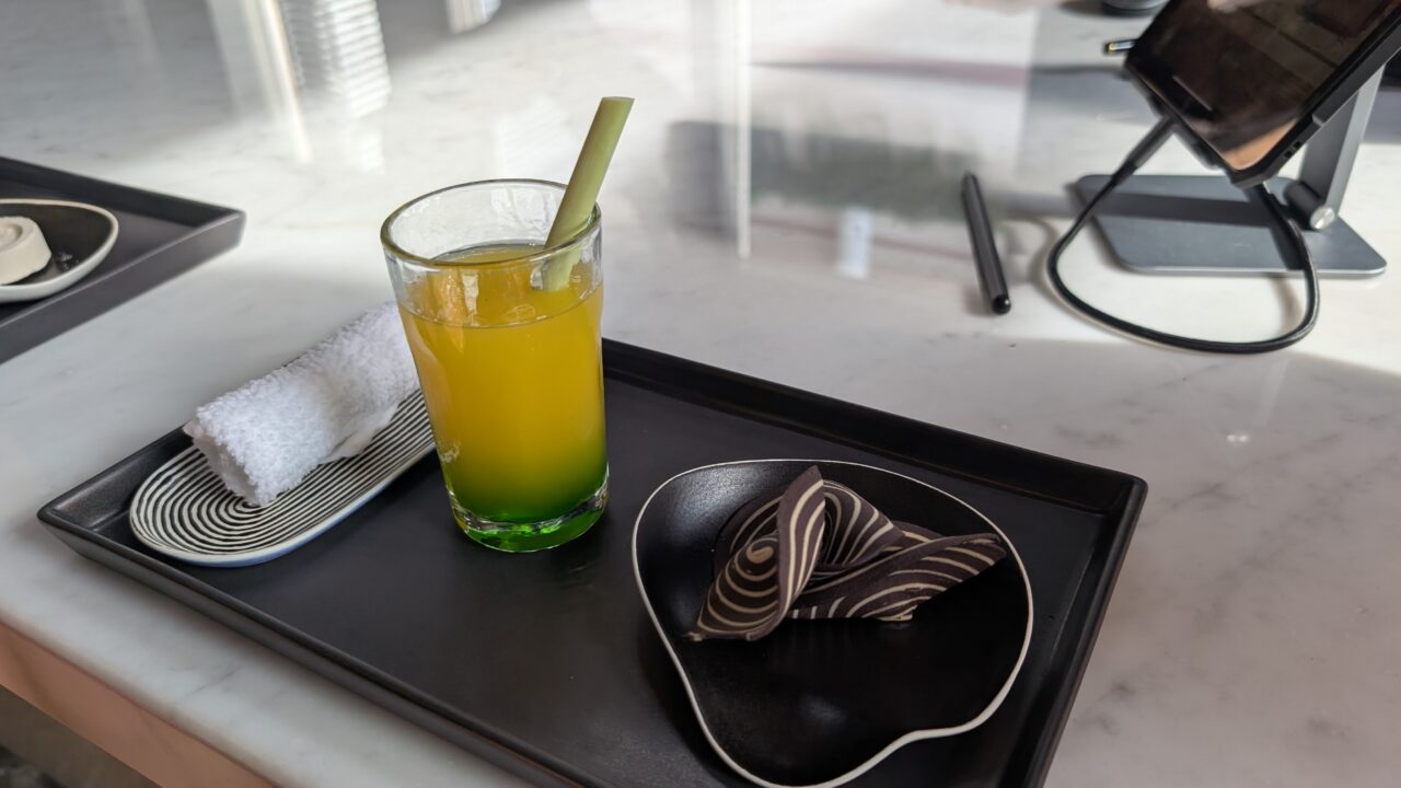 このウェルカムドリンクを飲みながらチェックイン手続きです。