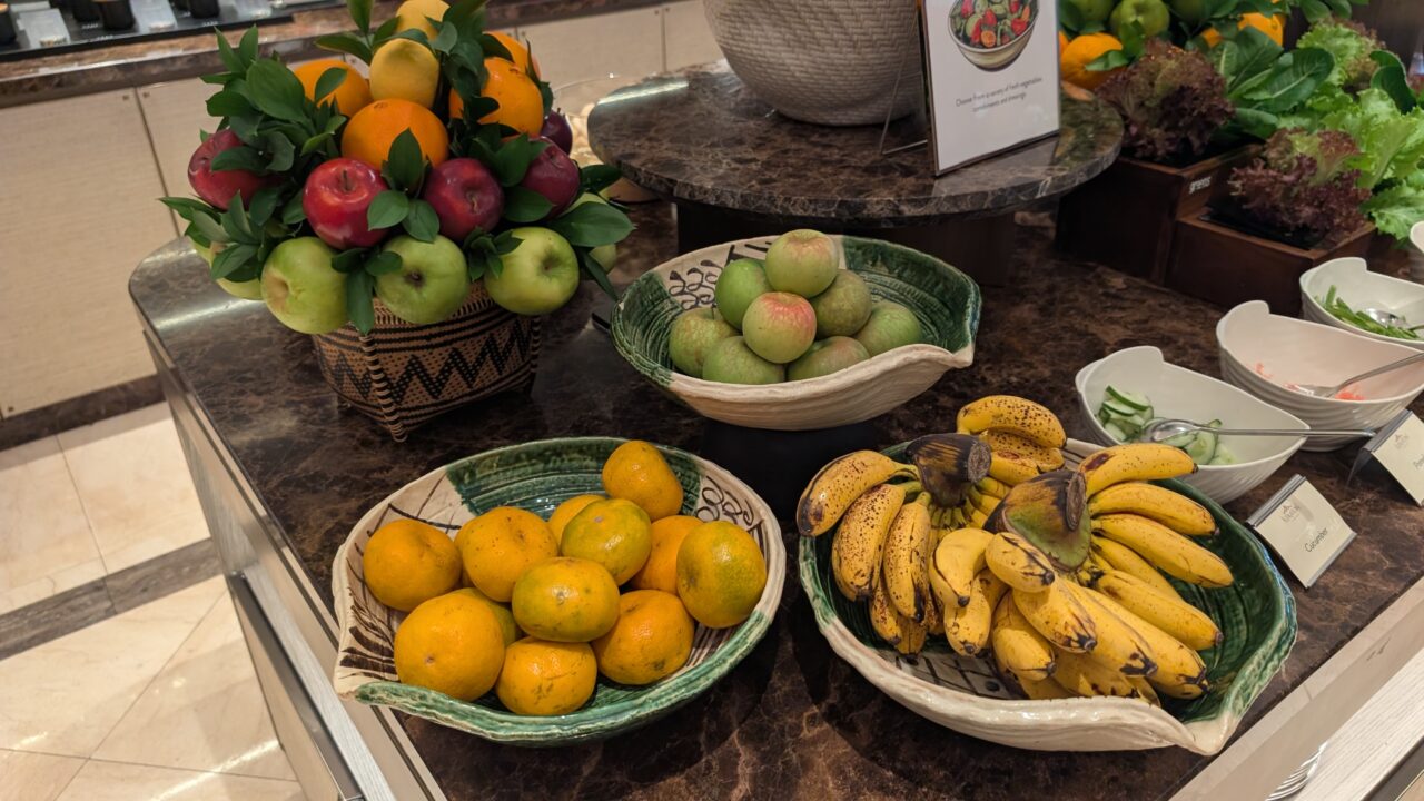バナナ、リンゴ、スネークフルーツの入ったボウルの隣には、