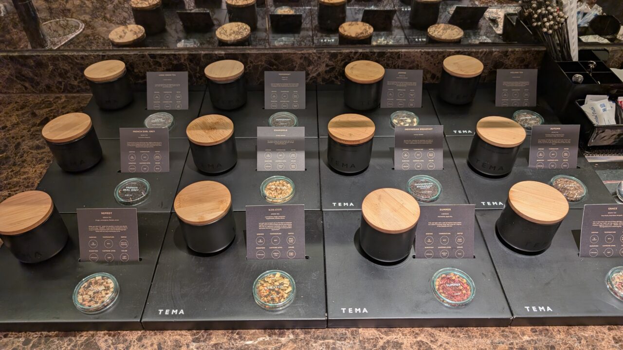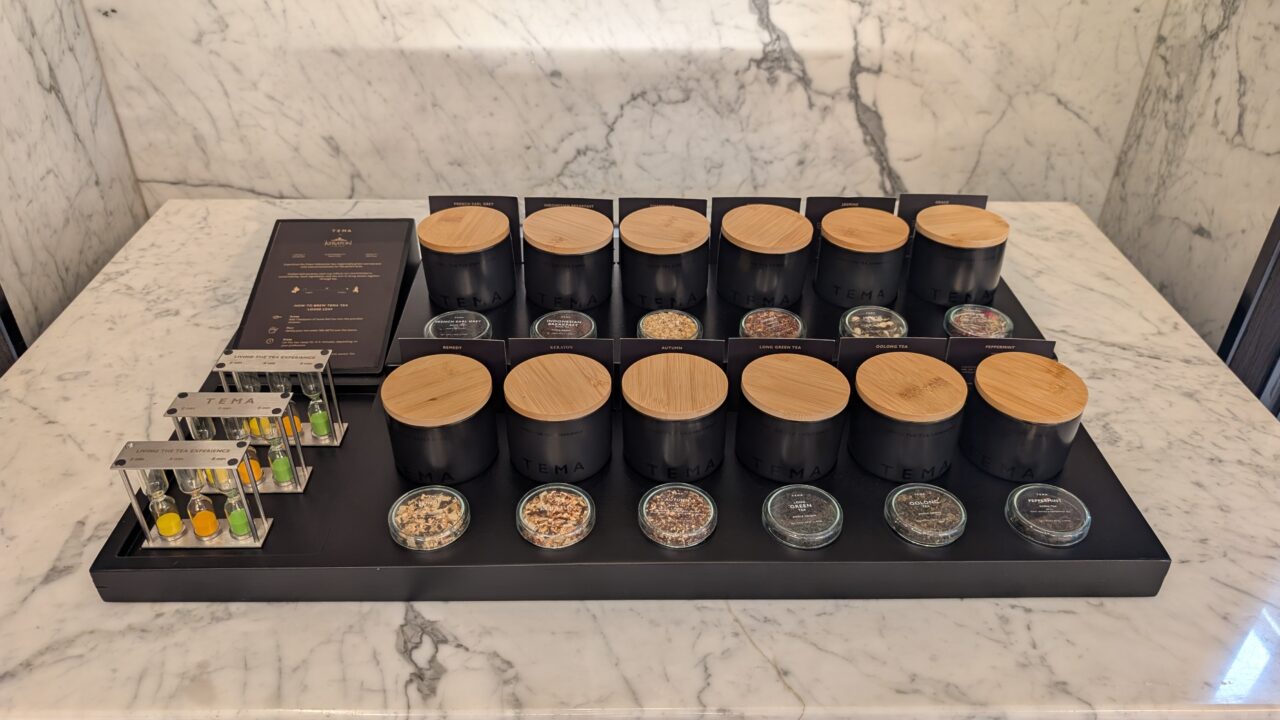 おしゃれなブラック&ウッドのティーボックスに、茶葉見本が並びます。