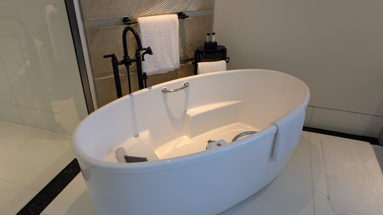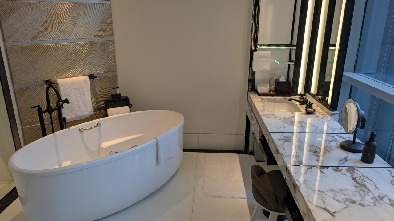 バスルームには、ゆったりとした独立型バスタブと大理石のダブルシンク。