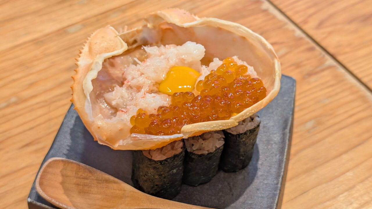 看板メニューの「エビカニ合戦」。見た瞬間ちょっとテンション上がるやつです。カニの甲羅にたっぷり詰まった身に、いくらと卵黄。これを下の巻きにのせて食べるスタイルで、見た目も味もちゃんと“主役感”。