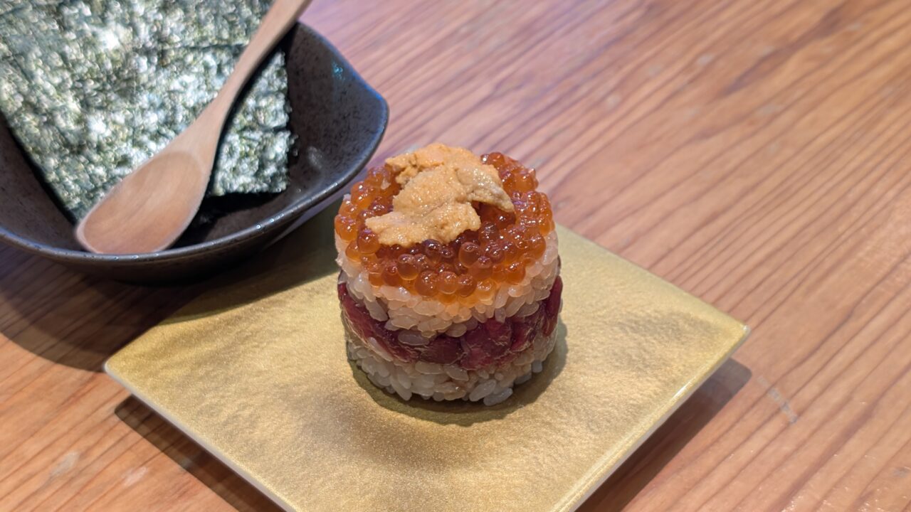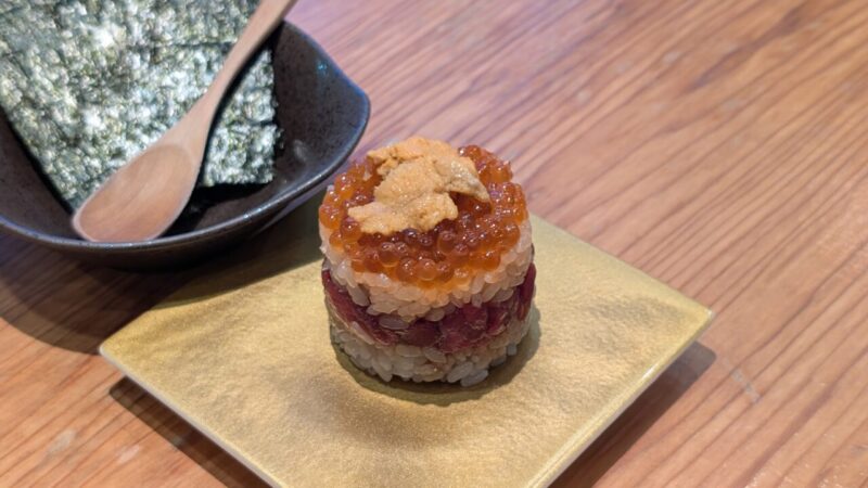 「雲丹いくらミルフィーユ」。ご飯とネタで層を作り、その上に、いくらと雲丹。満足度が高い!頼んで正解です。
