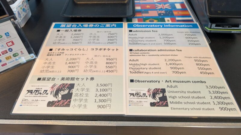 まずは受付カウンターでチケットを発券。料金表を見るとそこそこしますが、今回はホテル宿泊者特典活用。チェックイン時にもらった引換券を出すだけで、そのままチケットに交換できます。こういう“さりげない特典”、地味に嬉しいです。