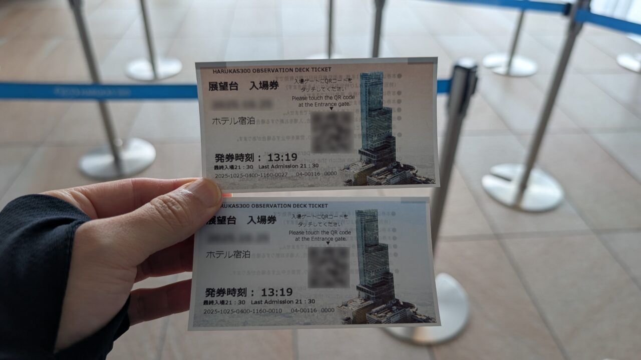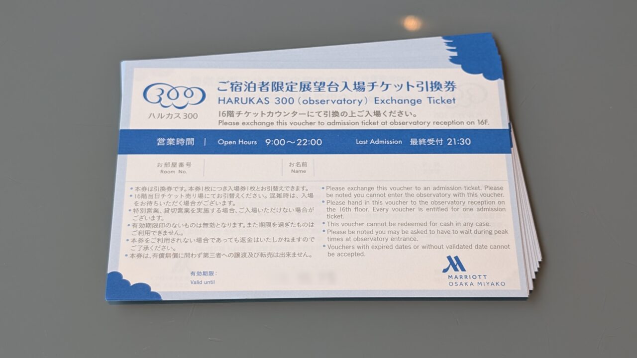 あべのハルカスの展望台チケットももらえます。人数分×宿泊数分。長期滞在の僕たちはけっこうな枚数になります。こんなに行くかなと思いながら受け取りますが、「いつでも行ける状態」があるのは悪くない。この余裕が、滞在の質を少し変えている気がします。