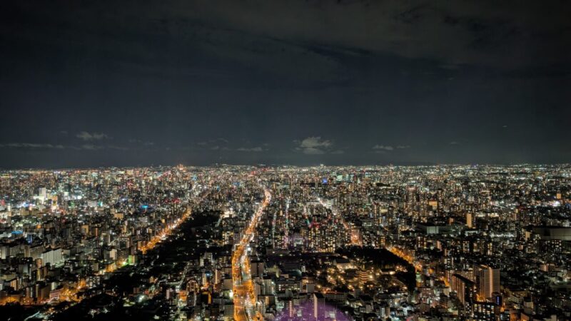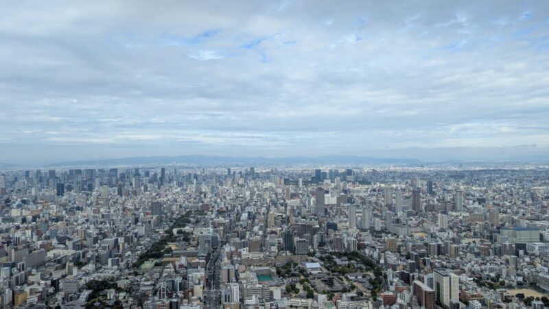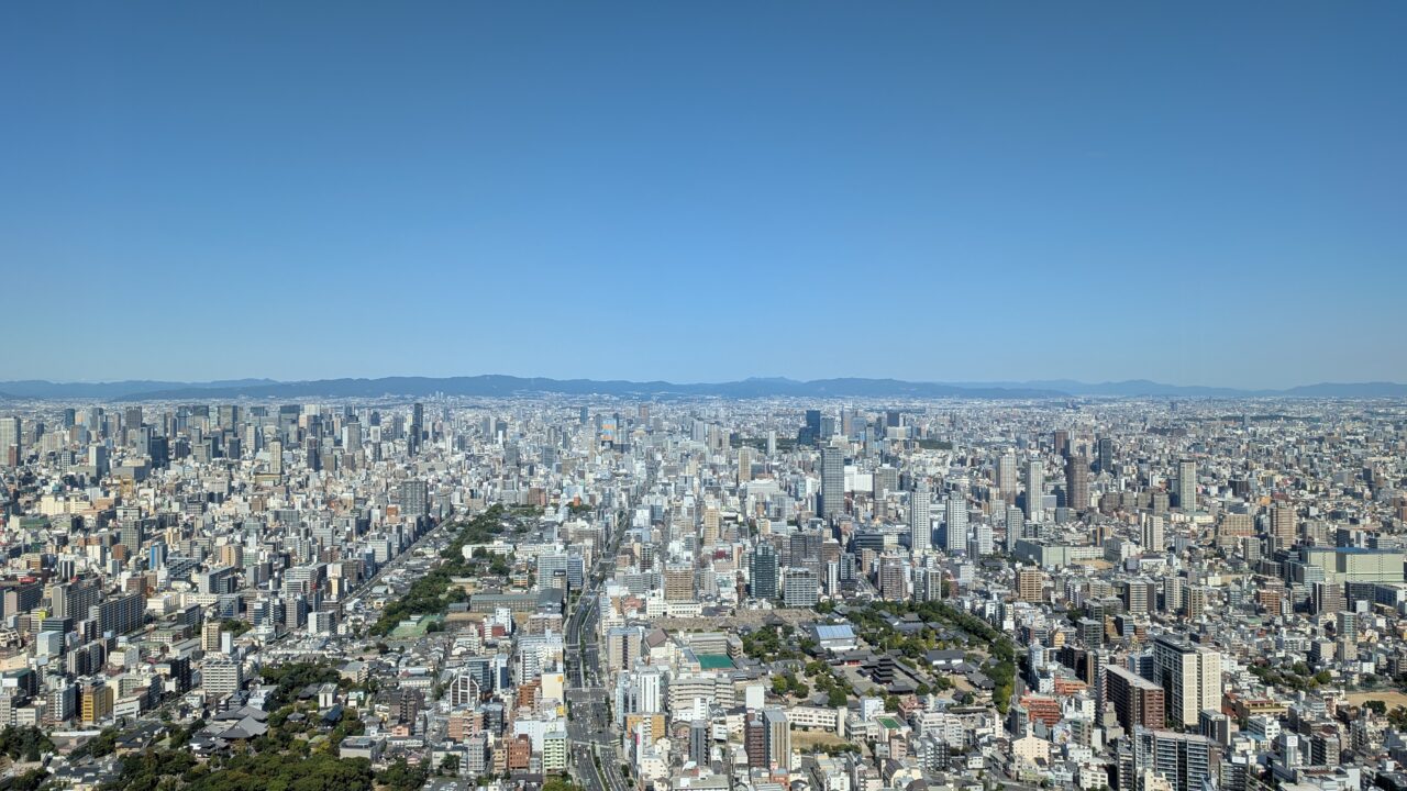大阪の街が、ここまで整然と広がってるのかってちょっと驚きます。ビルの密度も、道の流れも、上から見るとすごくきれいに見えます。