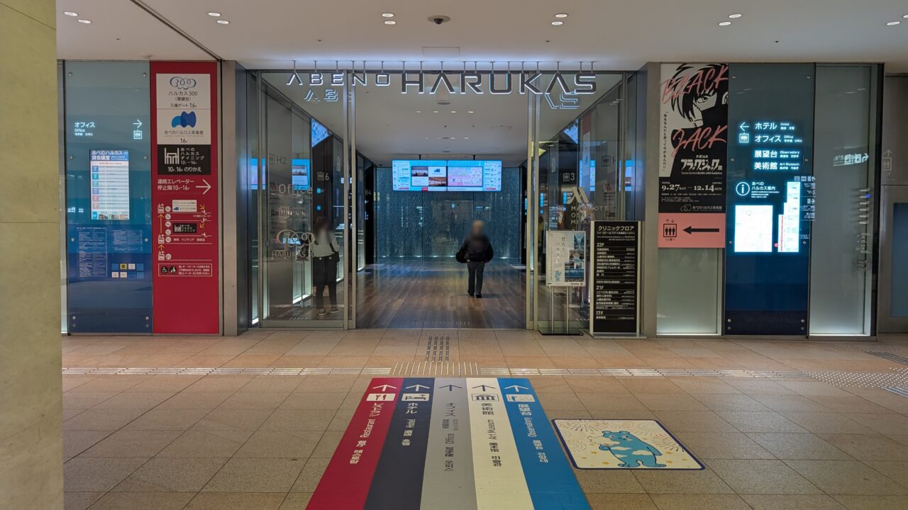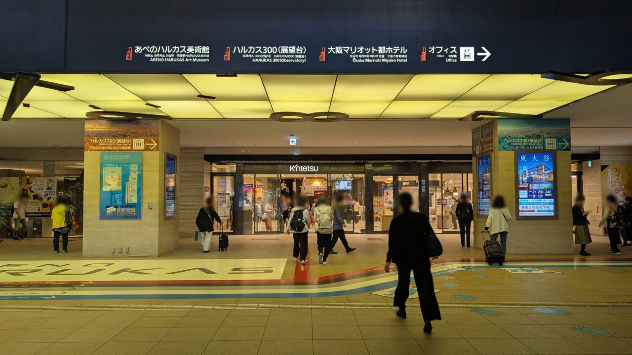 地下に降りると、あべのハルカスの入口、近鉄百貨店の前に出ます。このあたりは人の流れも多くて、初めてでも「あ、こっちだな」と感覚的に分かる動線になっています。