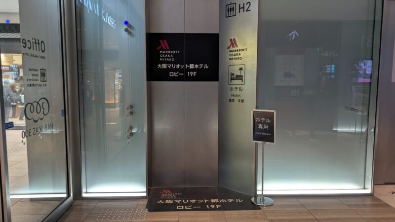 そのまま進むとホテル専用のエレベーターがあります。これで19階のホテルロビーに向かいます。乗り込んで扉が閉まると、外の気配が一気に遮断されます。上に向かっているだけなのに、情報が減っていく感覚。