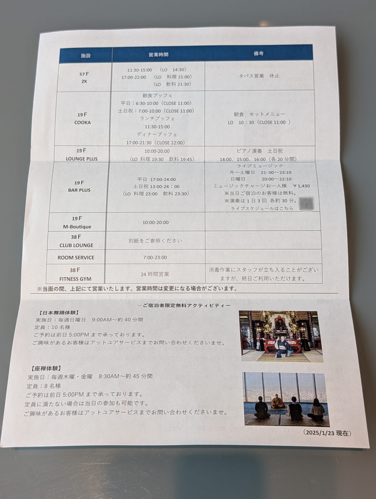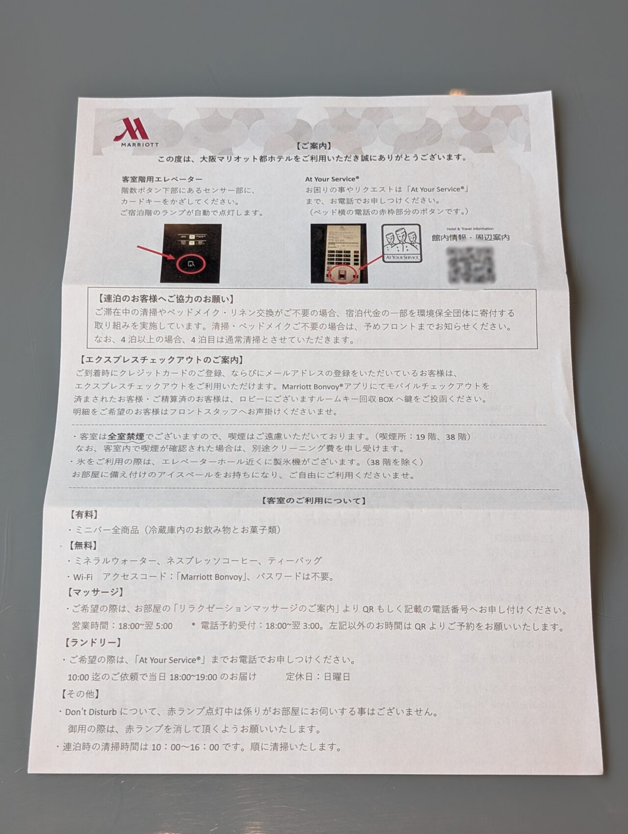 案内の紙も一式もらいます。設備や営業時間、サービス内容などがまとまっています。「必要な情報がちゃんと用意されている」という安心感があります。