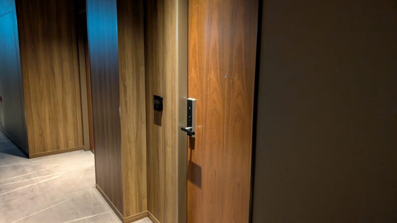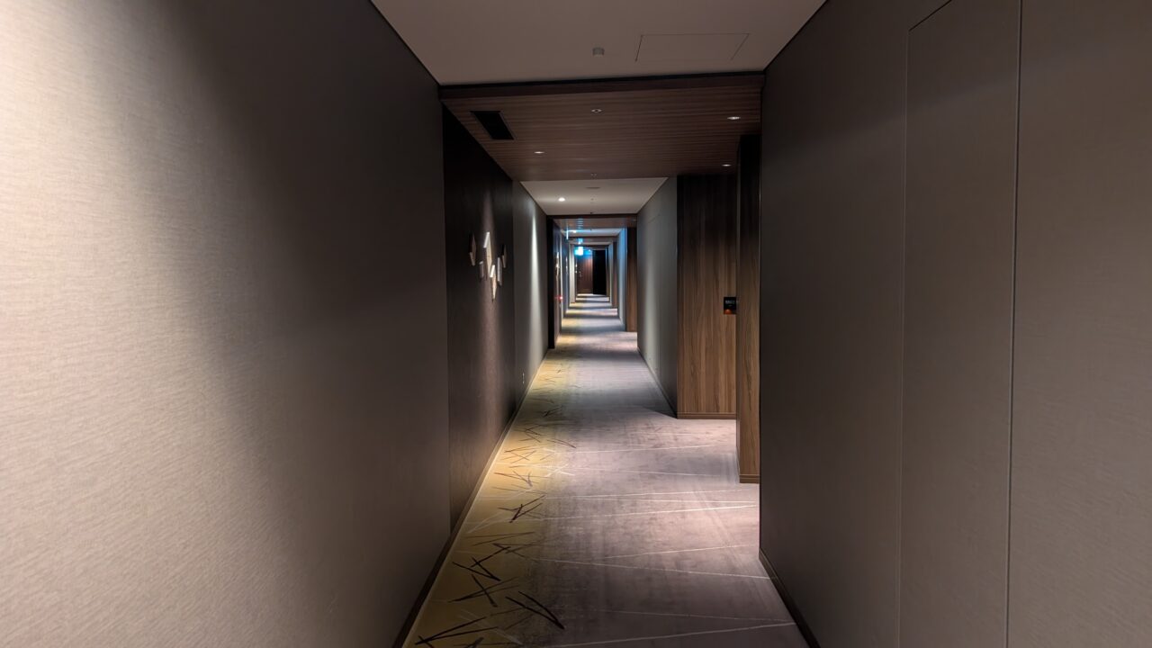 廊下は少し暗めで、照明も控えめ。足音も吸収される感じで、静かです。長い通路を歩いているのに、急かされない。動線がまっすぐで迷いもない、移動そのものにストレスがありません。こういう移動の質って、意外と見落としがちです。