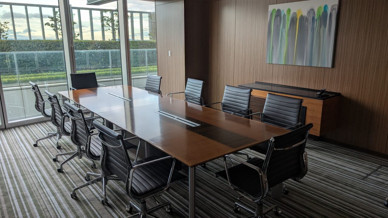 中に入ると、まず目に入るのがミーティングスペース。大きめのテーブルにしっかりした椅子、そして窓からの光も入ってきて、落ち着いて話すにはちょうどいい空間です。