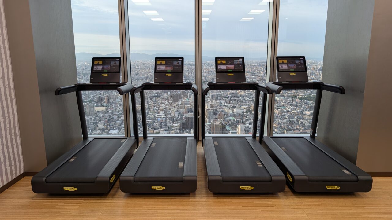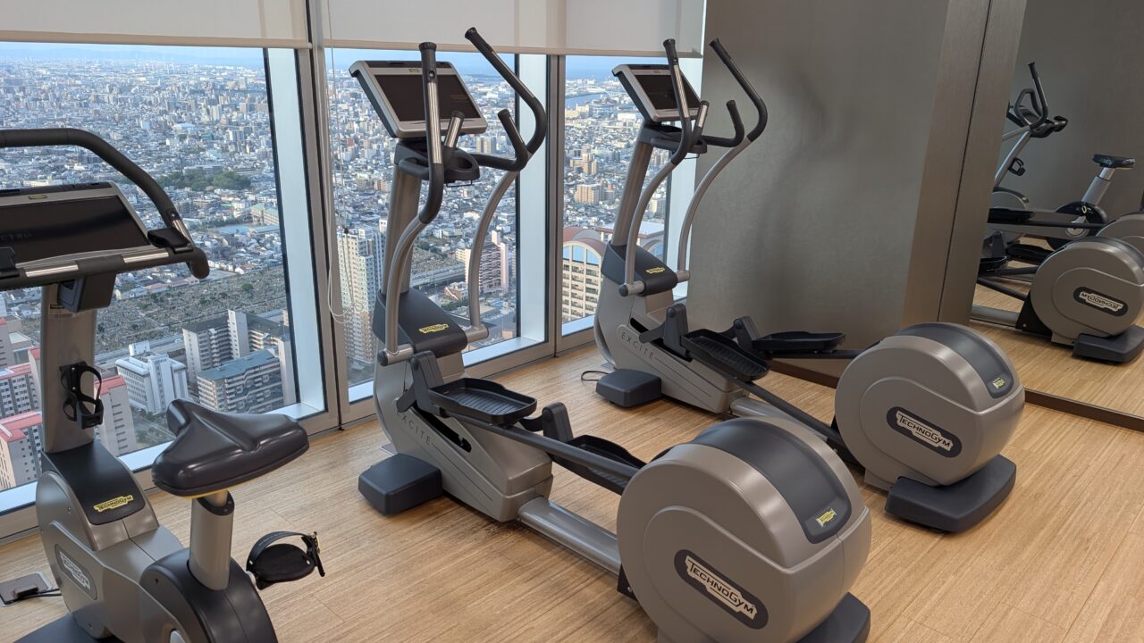 フィットネスジムは38階にあり、24時間利用可能です。宿泊者ならいつでも使えるのが嬉しいポイント。朝でも夜でも、自分のペースで体を動かせます。