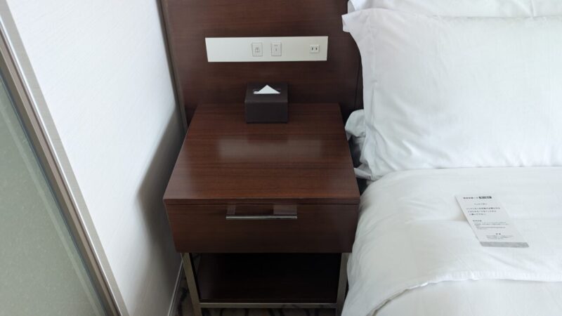 左右のナイトテーブルも必要なものだけ。左はコンセントとティッシュだけでスッキリ。右側には電話と時計、あと引き出しの中にセーフティボックス。この配置、無駄がなくて使いやすいです。